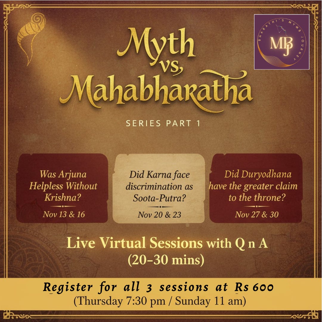 - Step 3: AFTER you complete Step 1 and 2, I’ll message the link to join the WhatsApp group for Myth vs Mahabharatha where further info will be shared both before and after the session.